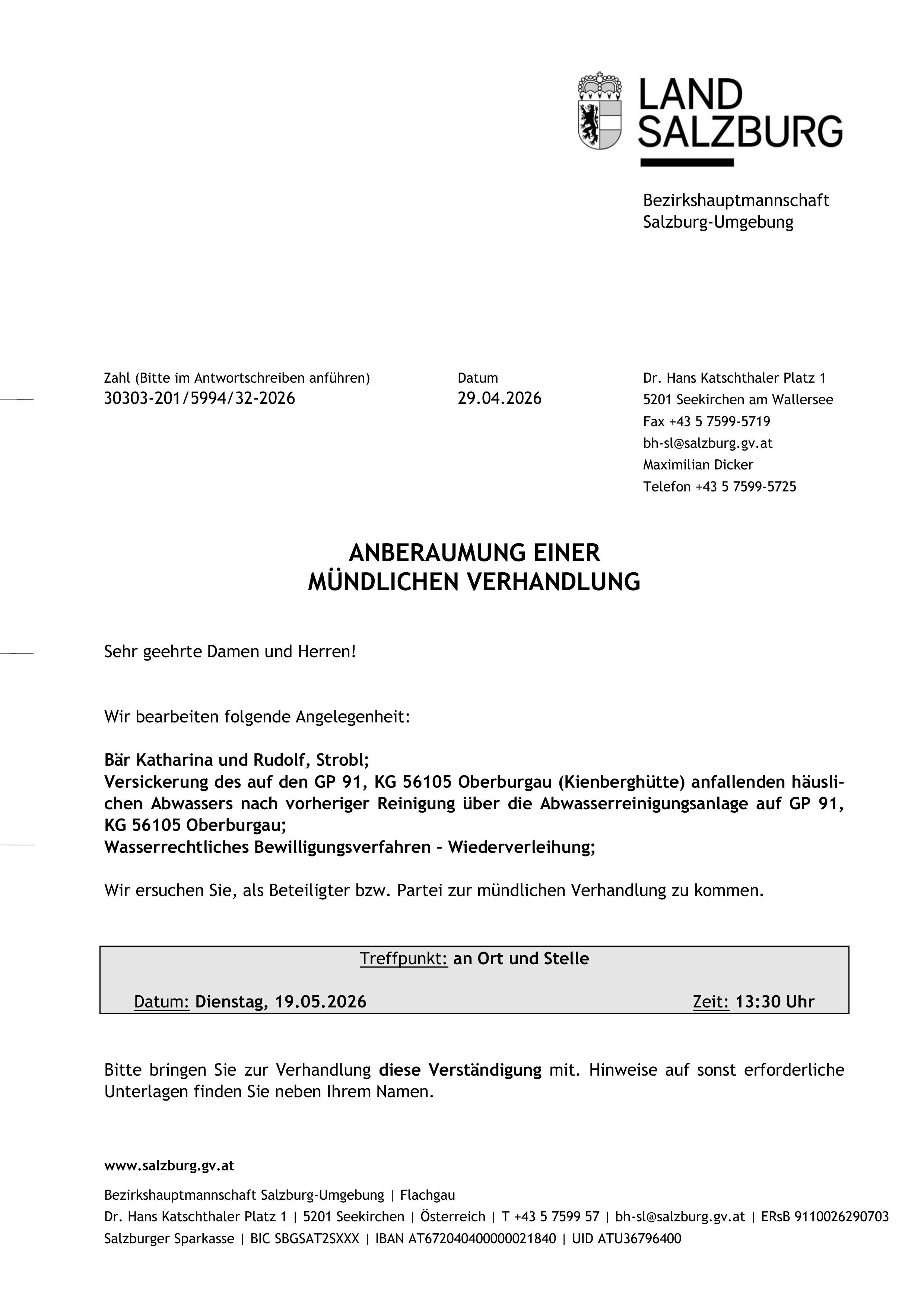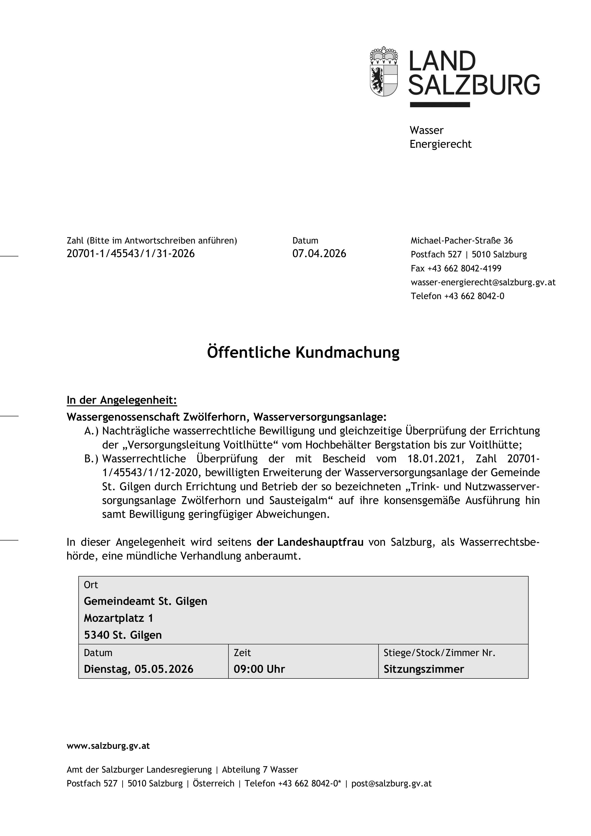 Mündl. Verh., Wassergenossenschaft Zwölferhorn, Errichtung Versorgungsleitung Voitlhütte, Überprüfung und nachträgliche wasserrechtliche Bewilligung sowie Überprüfung Erweiterung Wasserversorgungsanlage Zwölferhorn und Sausteigalm