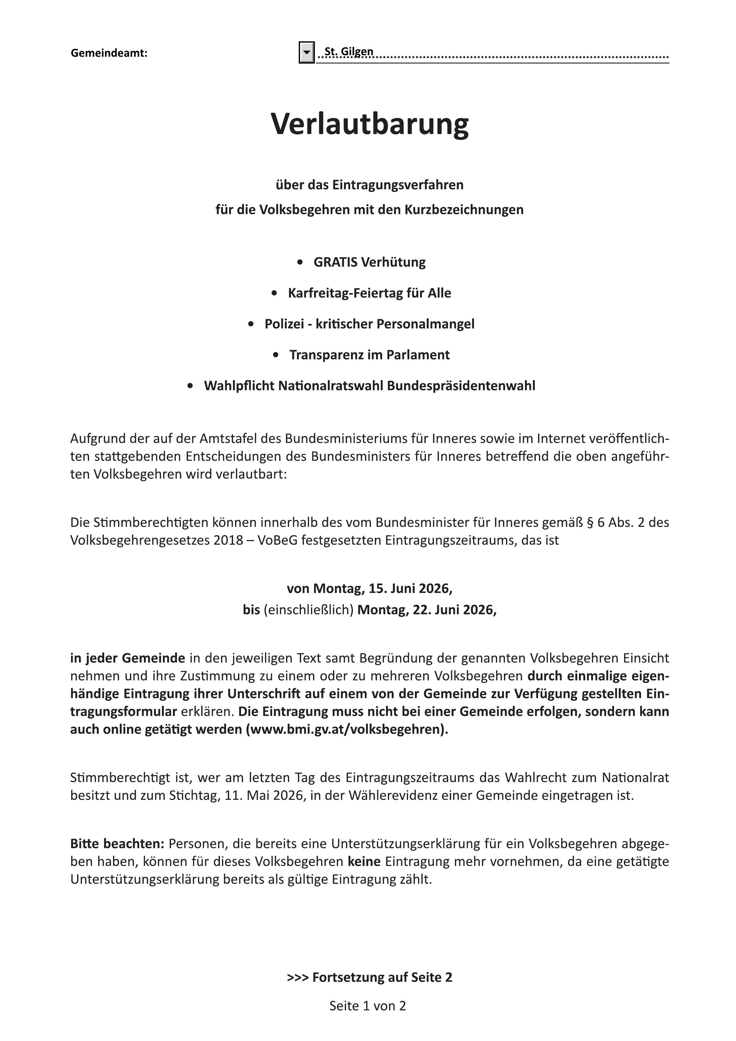 Verlautbarung über das Eintragungsverfahren für die Volksbegehren mit den Kurzbereichnungen: